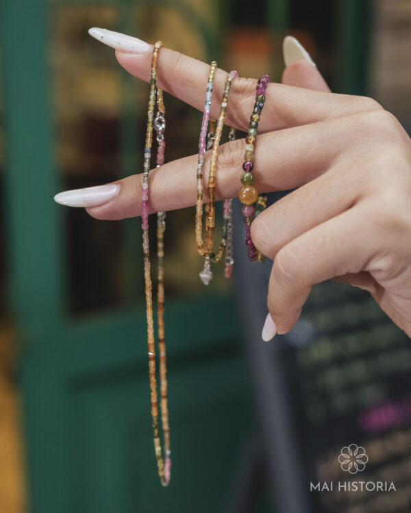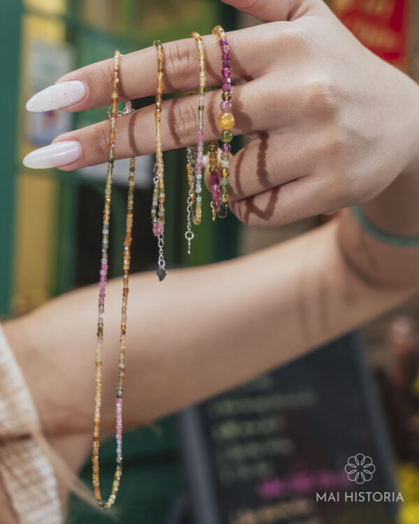 Vẫn là những dải màu rực rỡ của Tourmaline, nhưng lần này, set vòng được thiết kế với hạt đá nhỏ hơn, mang đến cảm giác nhẹ nhàng và thanh thoát hơn. Sự kết hợp hài hòa giữa sắc hồng, cam, xanh và teal tạo nên điểm nhấn tinh tế, giúp bạn dễ dàng phối cùng mọi phong cách, từ dịu dàng đến cá tính. 🌸💛🌿